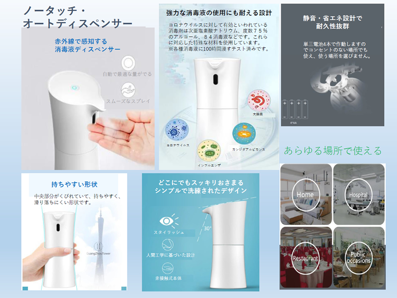 トイレなどに従来あったものは、ソープや消毒液を出すのにいちいちブッシュしないといけないタイプですね。しかし、多くの人が同じ個所を素手でプッシュする(触れる)のは、やはり安全とはいえません。そこで、手(指)をかざすだけでソープが出るこのディスペンサーがお勧めです。こういったオートディスペンサーは、通常高価な商品となりますが、本製品は、非常に廉価でかつ(手をかざすと感知する)センサーの反応も優れています。